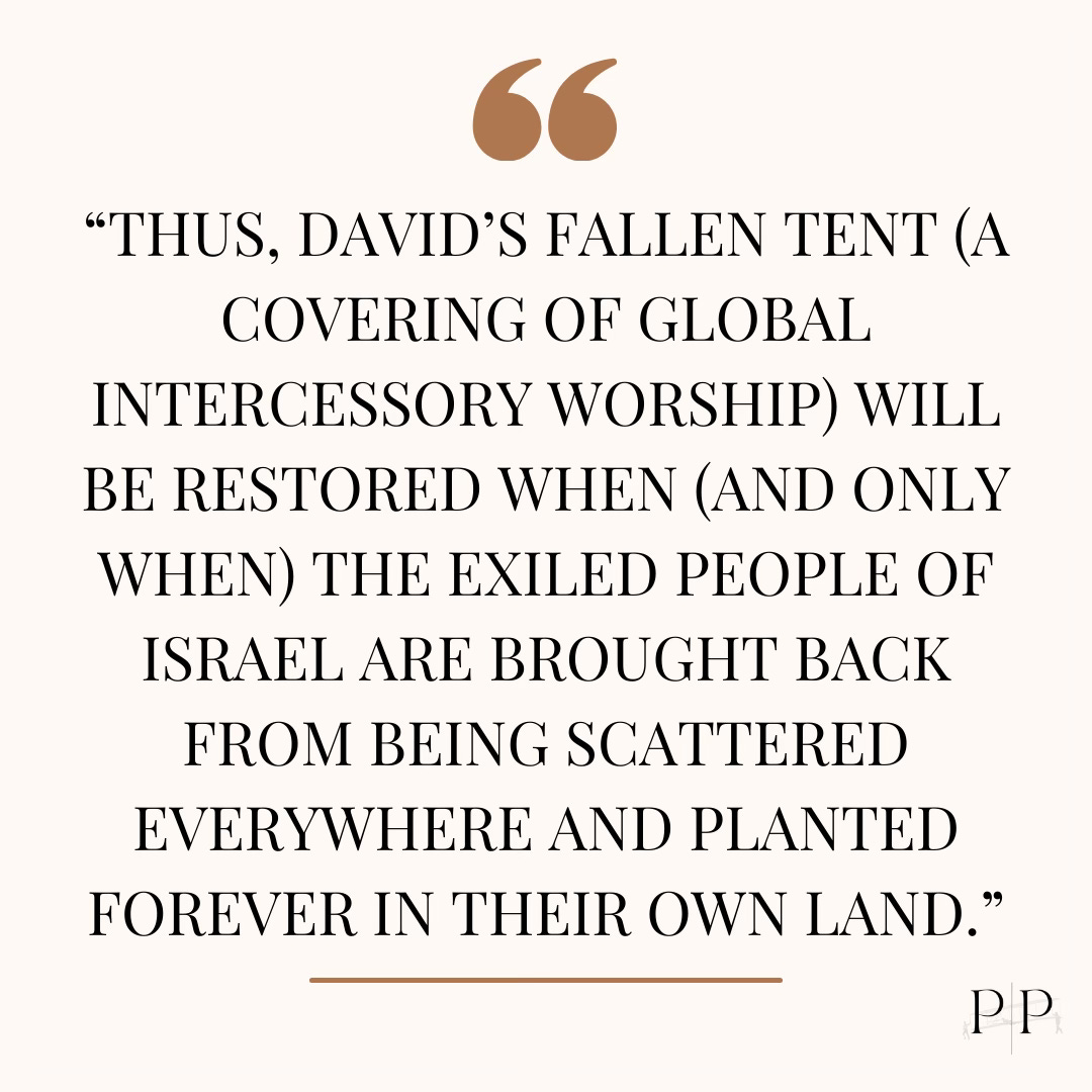 Of course, the certain things God intends to do involve all that we read of in the entire Amos prophecy. Thus, David’s fallen tent (a covering of global intercessory worship) will be restored when (and only when) the exiled people of Israel are brought back from being scattered everywhere and planted forever in their own land.