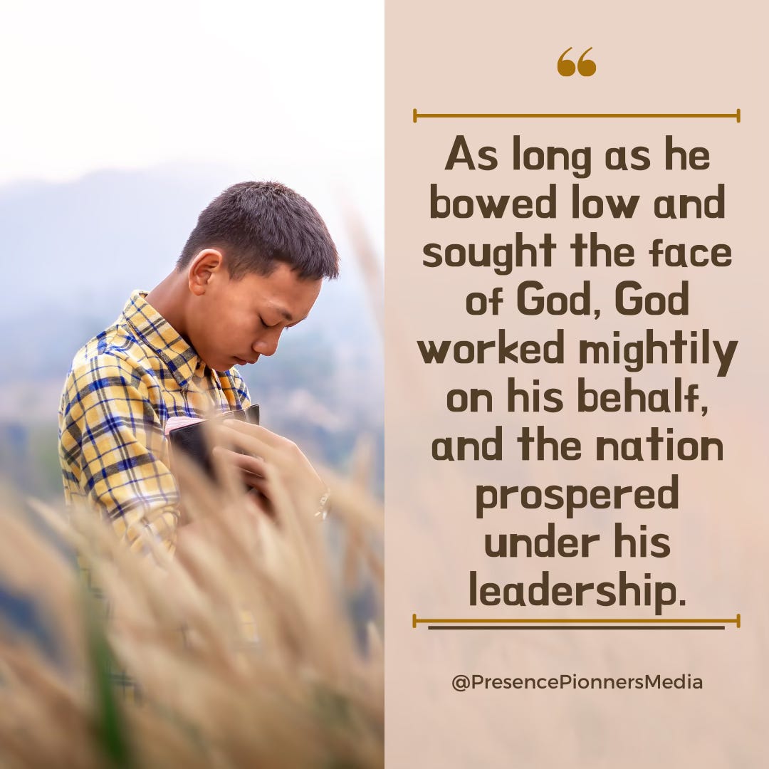 As a young man, the prophets taught him the fear of the Lord. As long as he bowed low and sought the face of God, God worked mightily on his behalf, and the nation prospered under his leadership. He went out and made war against Judah’s enemies and God gave him victory. The more help and favor the Lord released, the more Uzziah’s fame spread throughout the region. God gave him prosperity.