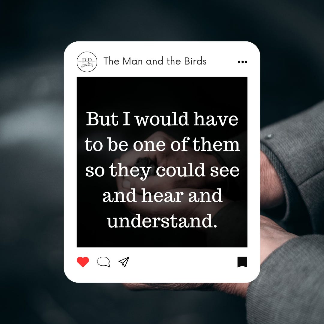 “If only I could be a bird,” he thought to himself, “and mingle with them and speak their language. Then I could tell them not to be afraid. Then I could show them the way to the safe warm barn. But I would have to be one of them so they could see and hear and understand.” At that moment the church bells began to ring. The sound reached his ears above the sounds of the wind. And he stood there listening to the bells listening to the bells pealing the glad tidings of Christmas. And he sank to his knees in the snow.