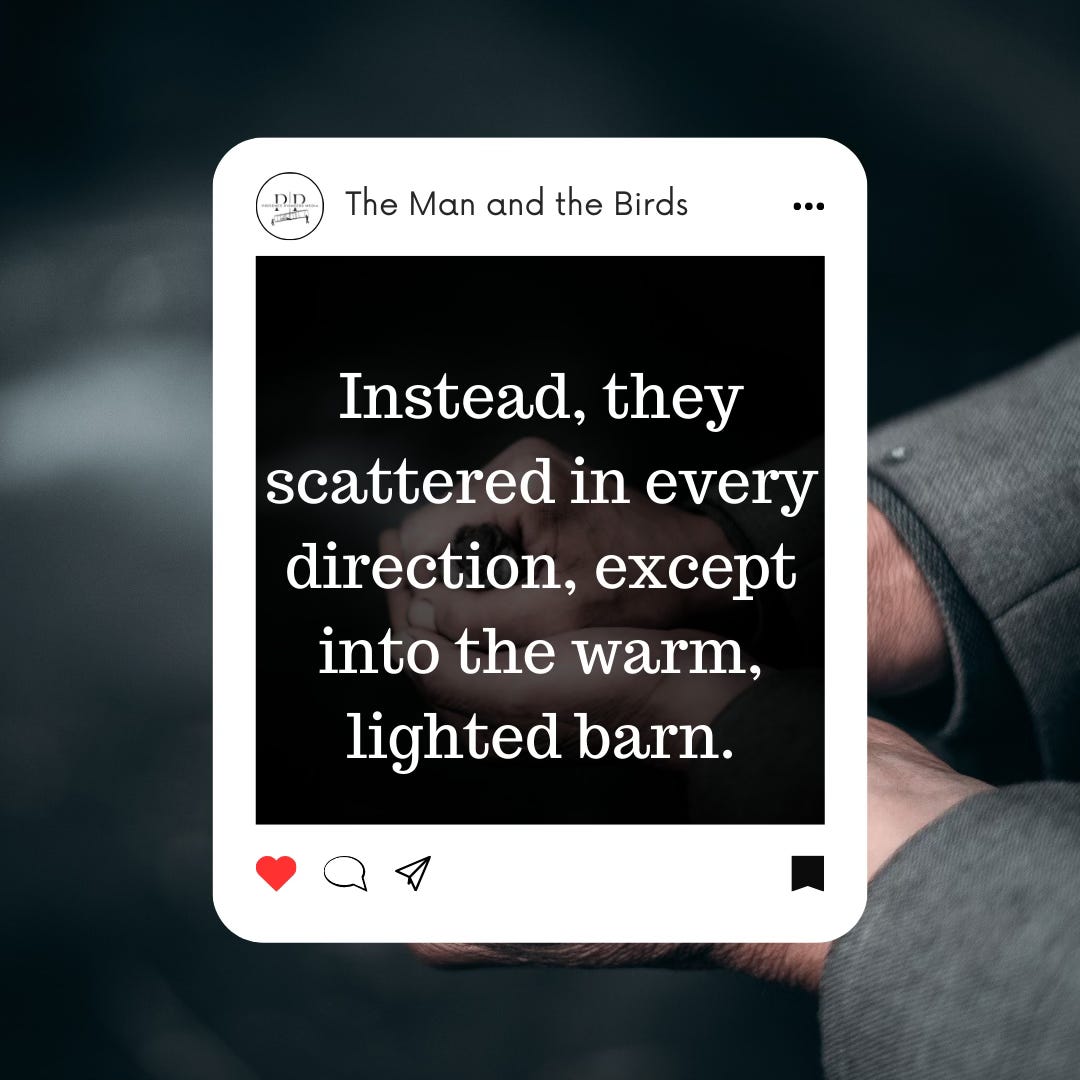 So he hurried back to the house, fetched bread crumbs, sprinkled them on the snow, making a trail to the yellow-lighted wide open doorway of the stable. But to his dismay, the birds ignored the bread crumbs, and continued to flap around helplessly in the snow. He tried catching them…He tried shooing them into the barn by walking around them waving his arms…Instead, they scattered in every direction, except into the warm, lighted barn.