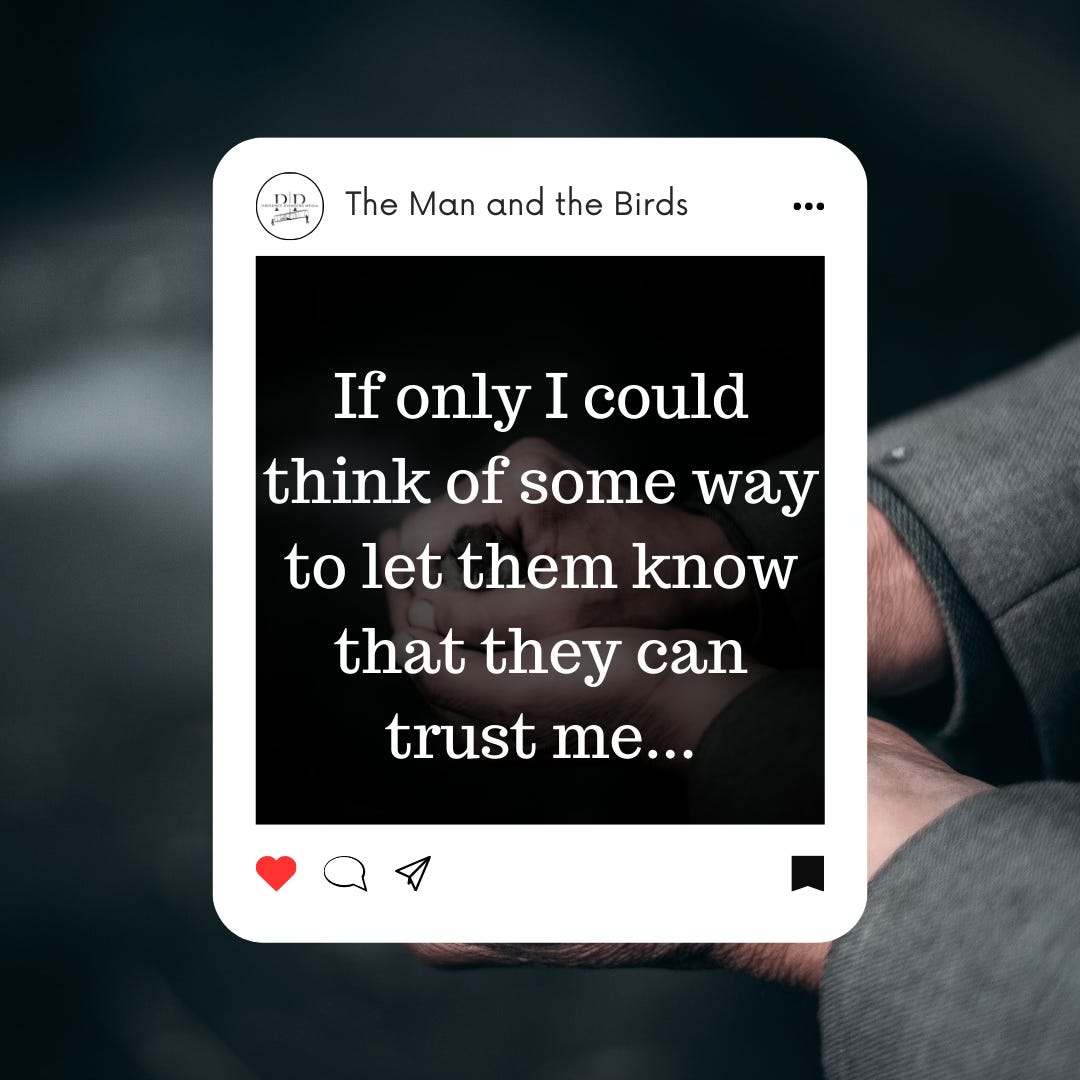 And then, he realized that they were afraid of him. To them, he reasoned, I am a strange and terrifying creature. If only I could think of some way to let them know that they can trust me…That I am not trying to hurt them, but to help them. But how? Because any move he made tended to frighten them, confuse them. They just would not follow. They would not be led or shooed because they feared him.