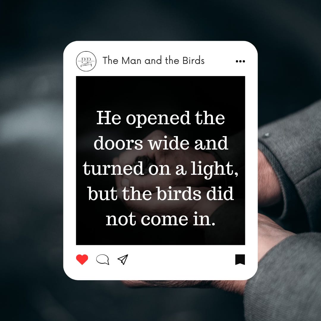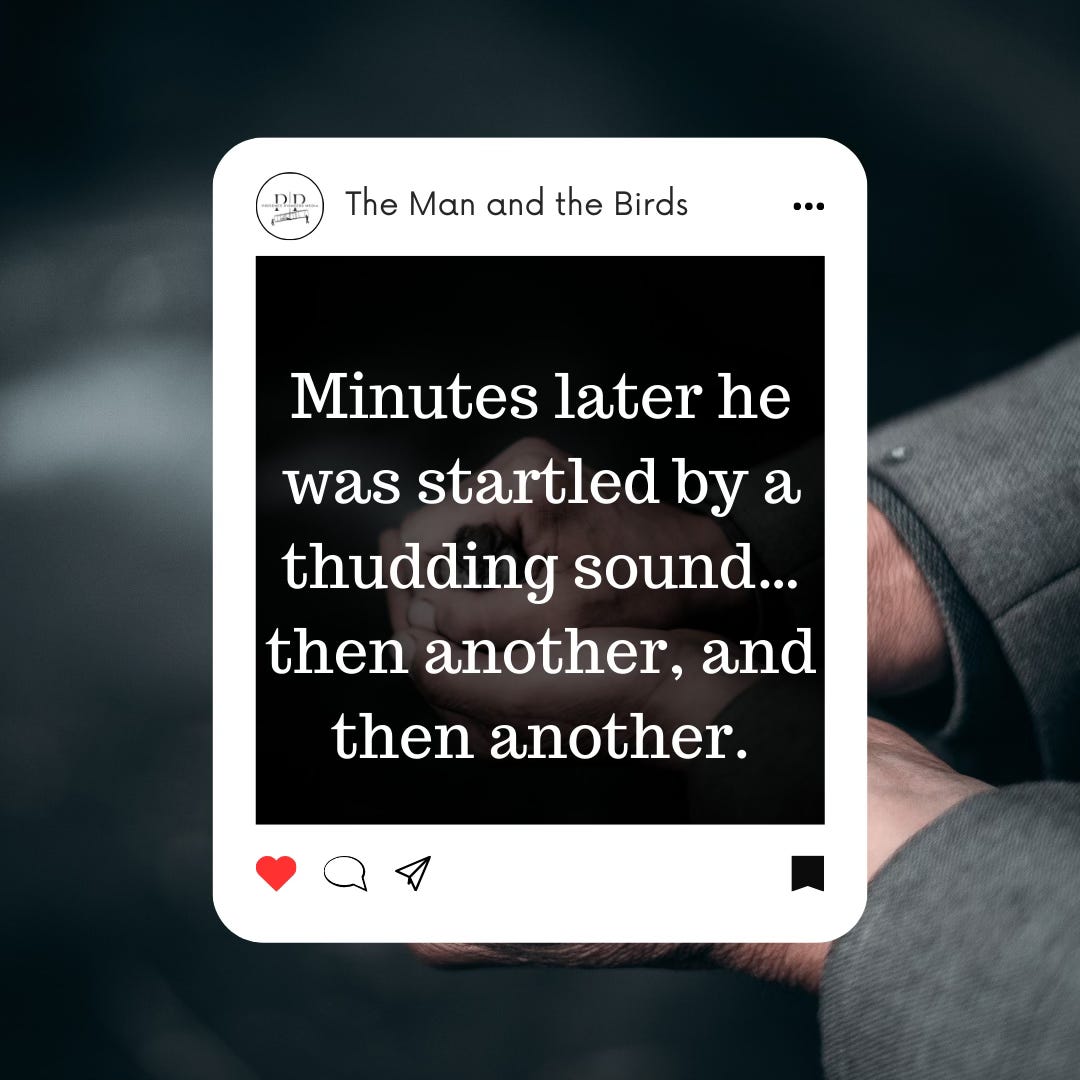 Shortly after the family drove away in the car, snow began to fall. He went to the window to watch the flurries getting heavier and heavier and then went back to his fireside chair and began to read his newspaper. Minutes later he was startled by a thudding sound…then another, and then another. Sort of a thump or a thud. At first he thought someone must be throwing snowballs against his living room window. But when he went to the front door to investigate he found a flock of birds huddled miserably in the snow. They’d been caught in the storm and, in a desperate search for shelter, had tried to fly through his large landscape window.