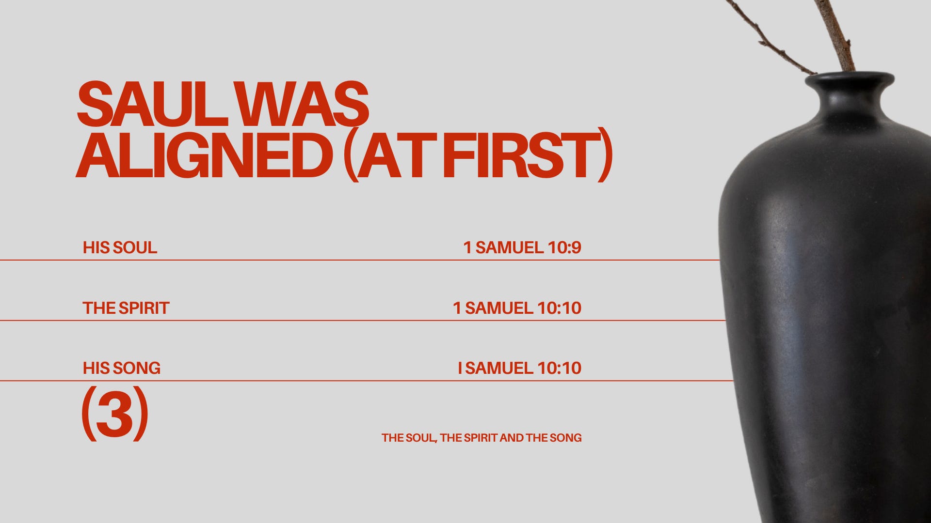 Initially, for Saul, there was alignment with his soul, his song, and the Spirit. God gave him a “new heart” (I Samuel 10:9). The Spirit of God rushed upon him, and the new king sang a new song (I Samuel 10:10).